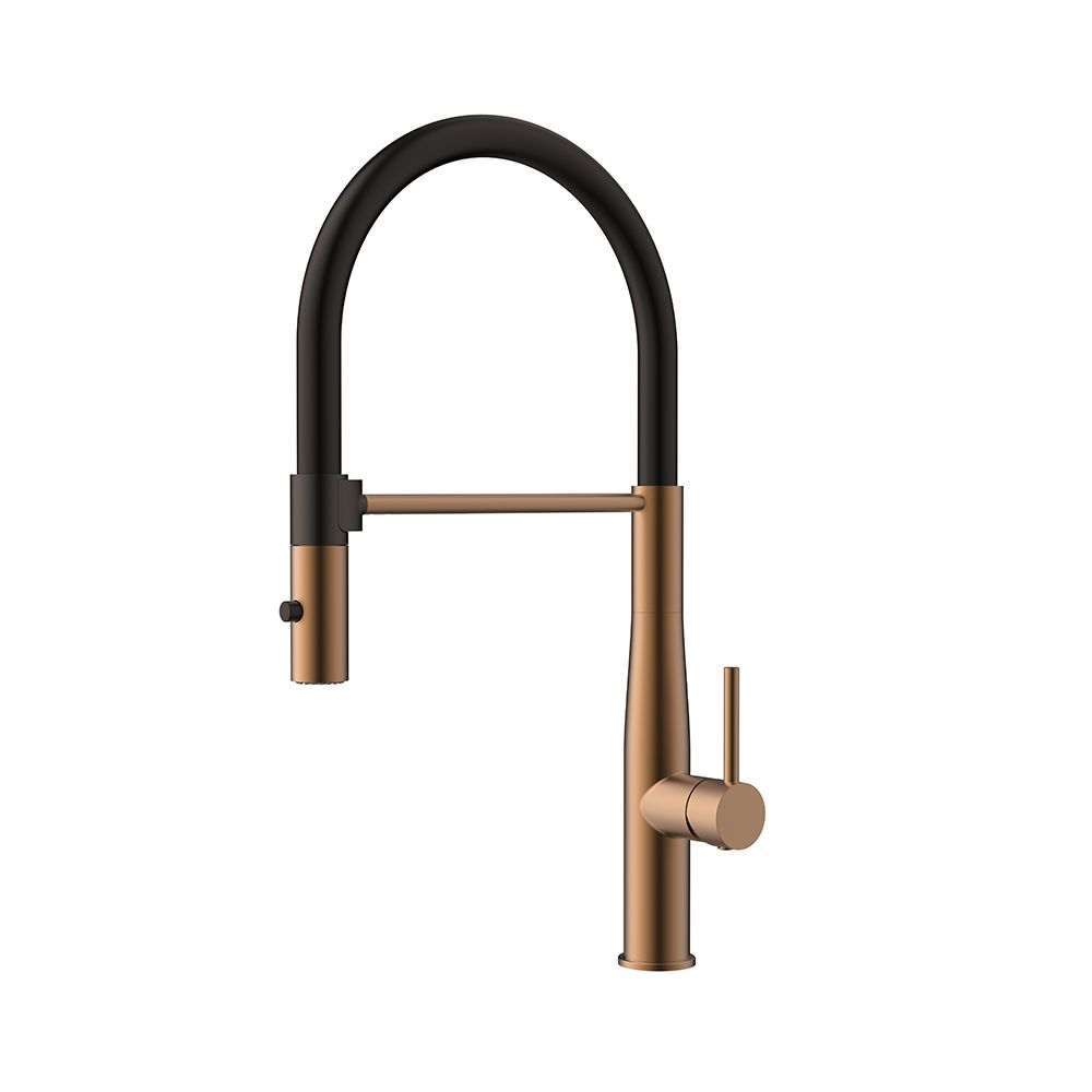 Μπαταρία κουζίνας Orabella, Bracket με αποσπώμενο, συρόμενο ντουζ δύο ροών και ρουξούνι ορειχάλκινο. Πρόκειται για μια μοντέρνα μπαταρία πάγκου, η οποία είναι κατασκευασμένη από τον οίκο Orabella, από υψηλής ποιότητας ορείχαλκο. Διατίθεται σε τρεις χρωματικές επιλογές: χρωμέ, μαύρο ματ και ροζ χρυσό.