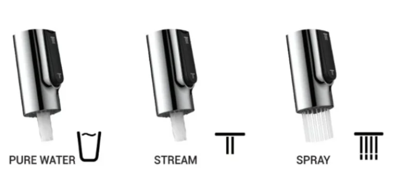 Μπαταρία κουζίνας Orabella, Pure water με αποσπώμενο ντουζ 2-ροών. Πρόκειται για μια μοντέρνα μπαταρία πάγκου, η οποία είναι κατασκευασμένη από ανοξείδωτο ατσάλι με χρωμέ φινίρισμα, η οποία προορίζεται τόσο για οικιακή, όσο και για επαγγελματική χρήση. Διατίθεται σε χρωμέ και μαύρο ματ.